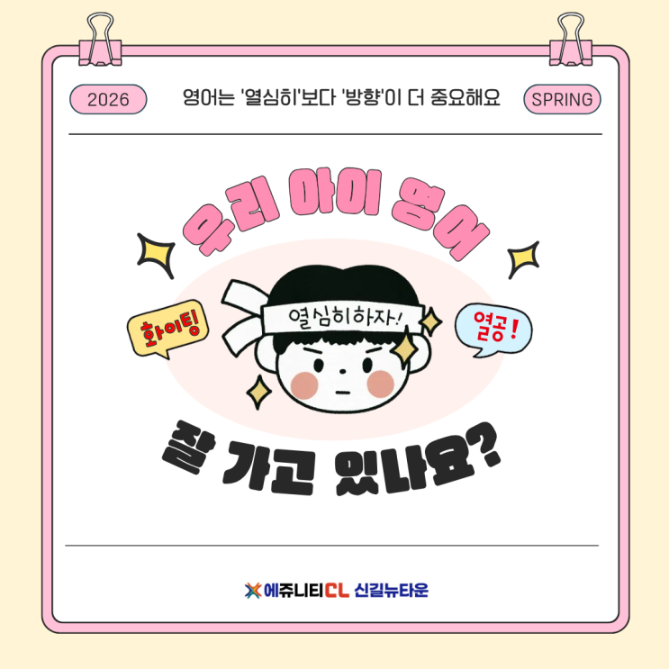 "우리 아이 영어, 정말 잘하고 있는 걸까요?" - 노력보다 중요한 것은 '방향'입니다. 안녕하세요, 에쥬니티CL 신길뉴타운입니다. 초등 영어를 시작한 학부모님들과 상담을 하다 보면, 아이의 성적표보다 더 깊은 곳에 있는 '근본적인 불안함'과 마주하게 됩니다. "우리 아이 영어, 이 정도면 잘하는 편인가요?" "지금 공부하는 방향이 맞는 건지 모르겠어요." "단어도 외우고 숙제도 꼬박꼬박 하는데, 왜 실력은 제자리 같죠?" 이 질문들은 단순한 궁금증이 아닙니다. 아이의 학습이 정체기에 머물러 있지는 않은지 확인하고 싶어 하시는 부모님의 아주 중요한 본능적 신호입니다. ....... <img src="https://blogthumb.pstatic.net/MjAyNjAzMzBfMTUw/MDAxNzc0ODM4MDgwODc5.Wul6kDjgIcWAq9L2FUixmT0K9HQvyanVVxVeYOfZuccg.-tE3gxiHldUaTa0y5dD6X0b3Wf4fP2Cj68ELNsKEfMcg.PNG/1.png?type=s3" />