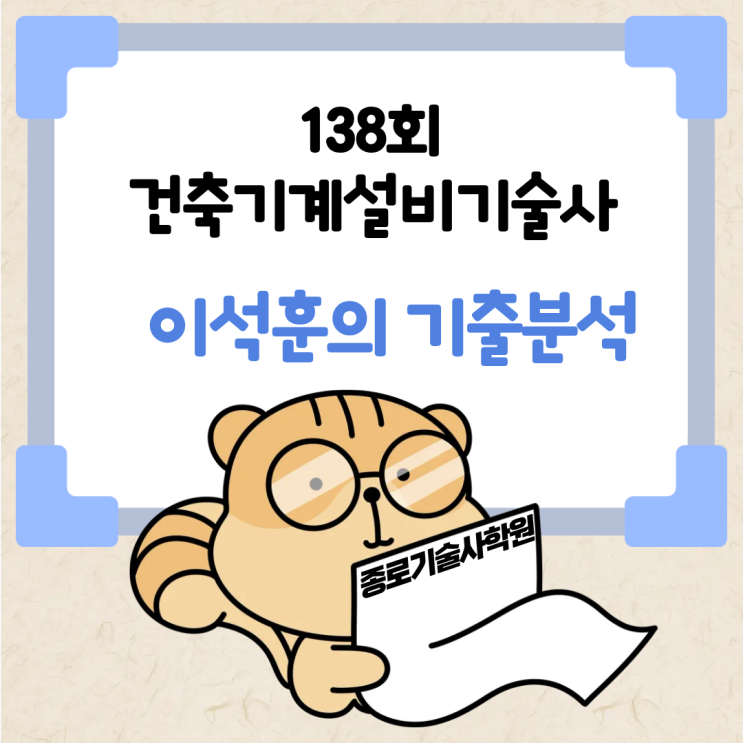 강의매칭률 및 기출분석 안녕하세요! 종로기술사학원 홍반장입니다. 138회 건축기계설비기술사 시험 잘 보셨나요? 시험이 끝나고 홀가분한 마음과 아쉬운 마음이 교차하시겠지만 우선은 스스로에게 정말 수고했다는 격려를 먼저 건네주셨으면 합니다. 이번 138회 건축기계설비기술사 시험은 기초 역학부터 최신 에너지 정책, 그리고 현장 실무까지 아주 폭넓게 출제되었습니다. 저희 종로기술사학원 이석훈 강사님이 분석한 출제 매칭 현황을 통해 이번 시험을 복기하고 다음 스텝을 준비해 볼까요? 138회 건축기계설비기술사 교시별 적중 분석 이번 시험의 가장 큰 특징은 본교재와 예상문제, 그리고 10 TO 10 특강에서의 높은 적중률을 보이고....... <img src="https://blogthumb.pstatic.net/MjAyNjAyMTJfMjYz/MDAxNzcwODkzMzY0NTU1.iTnbJE5SXTcg_B3uy0XVCytzkmKZ4cY0cZ8GoJggA6cg.Zc7br7522CqvDylOeKsXI3RPSnmtKqyDb-YB2Z9M2kgg.PNG/%C1%A6%B8%F1%C0%BB_%C0%D4%B7%C2%C7%D8%C1%D6%BC%BC%BF%E4._%2828%29.png?type=s3" />