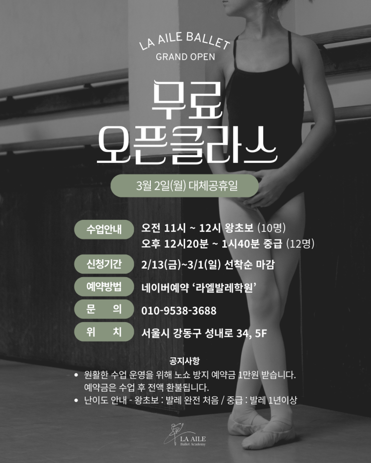강동구 하이엔드 성인전문 발레학원 OPEN ✨ 라엘발레 2호점, 3월 3일 정식 오픈합니다 라엘발레가 드디어 성인만을 위한 전문 발레 공간으로 새로운 시작을 합니다. 아이들 수업과는 완전히 분리된, 오롯이 성인을 위한 수업 구조와 공간 설계. 더 깊이 있게, 더 집중해서 발레를 배우고 싶은 분들을 위해 준비했습니다. 3/2(월) 무료 오픈클래스 안내 정식 오픈 하루 전, 라엘발레 2호점에서 첫 수업을 진행합니다. ✔ 오전 11:00 – 왕초보 클래스 (정원 10명) ✔ 오후 12:20 – 중급 클래스 (정원 12명) 신청 방법 네이버 예약 ‘라엘발레학원’ 검색 2/13 오후 12시 예약 오픈 신규회원 한정 / 선착순 신청으로 조기 마감될....... <img src="https://blogthumb.pstatic.net/MjAyNjAyMTNfMjk5/MDAxNzcwOTQ5OTkyNzA4.VzSqw7MEPZ3Yak0sthj7aNu_G9WXACBuwZ9bMlLE1Wcg.HqXBdr-M7pkjbjecpyrUvAqMcbB9d89DTqG7lIzEFA4g.PNG/%B9%AB%B7%E1%BF%C0%C7%C2%C5%AC%B6%F3%BD%BA.png?type=s3" />