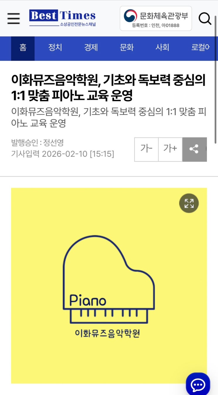 이번에 저희 학원의 교육 철학과 수업 방향을 담은 인터뷰 기사가 소개되었습니다. 아이들이 단순히 피아노를 ‘배우는 것’을 넘어 음악을 통해 자신감을 얻고, 스스로 성장할 수 있도록 돕는 것이 저희 학원의 가장 큰 목표입니다. 특히 전공자로서의 전문적인 지도와 아이 한 명 한 명의 성향을 고려한 맞춤 수업에 대해 솔직하게 담아보았습니다. 궁금하셨다면 이번 인터뷰를 통해 확인해보세요 :) 앞으로도 아이들의 작은 변화까지 놓치지 않는 따뜻한 교육을 이어가겠습니다. 감사합니다. https://www.besttimes.co.kr/7113 <img src="https://blogthumb.pstatic.net/MjAyNjAyMTVfMjA0/MDAxNzcxMDg1NjIzODEy.NTZgq9Fg4Pu074tdSCoR1ly2CLhPhU8DZ4SFcHquPasg.hu9l0Vjql_PkoRArEcG3oS1XlN-69pJPv2xaqGflb-kg.JPEG/IMG%A3%DF7594.jpg?type=s3" />