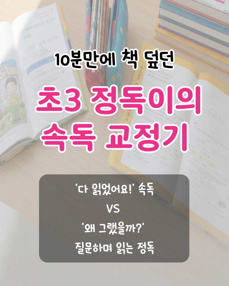 안녕하세요. 아이들의 성장을 매일 생각하는 매생이 선생님입니다! 오늘은 경주마처럼 책을 빨리 읽기 바빴던 초등 3학년 '정독이'의 이야기를 해보려 합니다. 아이가 책을 읽을 때, 또는 문제집을 풀 때 너무 빨리 읽는 것 같다면 집중해서 이 글을 끝까지 읽어 보세요. 많은 힌트를 얻을 수 있을 거예요. 자 그럼 3학년 정독이의 이야기를 통해 왜 읽기의 '속도'보다 '깊이'가 중요한지, 잘못 만들어진 읽기 습관을 어떻게 교정했는지 말씀드리겠습니다. 수면 위로 떠오른 속독의 문제 우리 정독이와는 3학년 2학기 직전에 만났어요. 처음엔 적응을 위해 3학년 초기 단계로 독서 수업을 시작했죠. 그런데 하루하....... <img src="https://blogthumb.pstatic.net/MjAyNTEyMjBfMTM5/MDAxNzY2MTk5MDk0MTA2.KQcq8h6pd2JK1w7fKlDclOkn9O0WszWJlAQtK0eJw3og.V98GFFiKwTaJiZ4vaXIanm9I4LdiA0zGM5jwqIxP7wog.PNG/image.png?type=s3" />