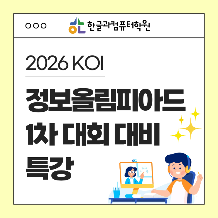 2026 정보올림피아드(KOI) 1차 대회가 5월 10일 토요일로 확정되었습니다. 지금은 실력을 점검하고 부족한 부분을 보완하며, 실전 감각을 끌어올려야 할 중요한 시기입니다. 한글과컴퓨터학원에서는 1차 대회를 더욱 체계적으로 준비할 수 있도록 특강을 마련하였습니다. 1교시와 2교시의 특성에 맞추어, 학생들이 보다 탄탄하게 대회를 대비할 수 있도록 준비했습니다. 1교시(필기) 특강 내용 : 기출문제 풀이 진행 방법 온라인/오프라인 동시 진행 실시간 오프라인 수업 : 대치점에서 진행 (평촌점 이원생중계) 실시간 온라인 수업 : ZOOM으로 진행 실시간 참여가 불가능한 경우, 녹화된 영상으로 수강 후 질의응답을 통해 부족한 부분을....... <img src="https://blogthumb.pstatic.net/MjAyNjA0MDFfNTEg/MDAxNzc1MDI2MjAzNTk1.h-flX0UGaE35yWPV08wx7ADscazDlyd8mOoFy5CWCpUg.dZ5BzAGdX31vkjeaDQT4s37Cx8O2A0_Fntd8j-F-SN8g.PNG/2026%C1%A4%BF%C31%C2%F7%C6%AF%B0%AD.png?type=s3" />