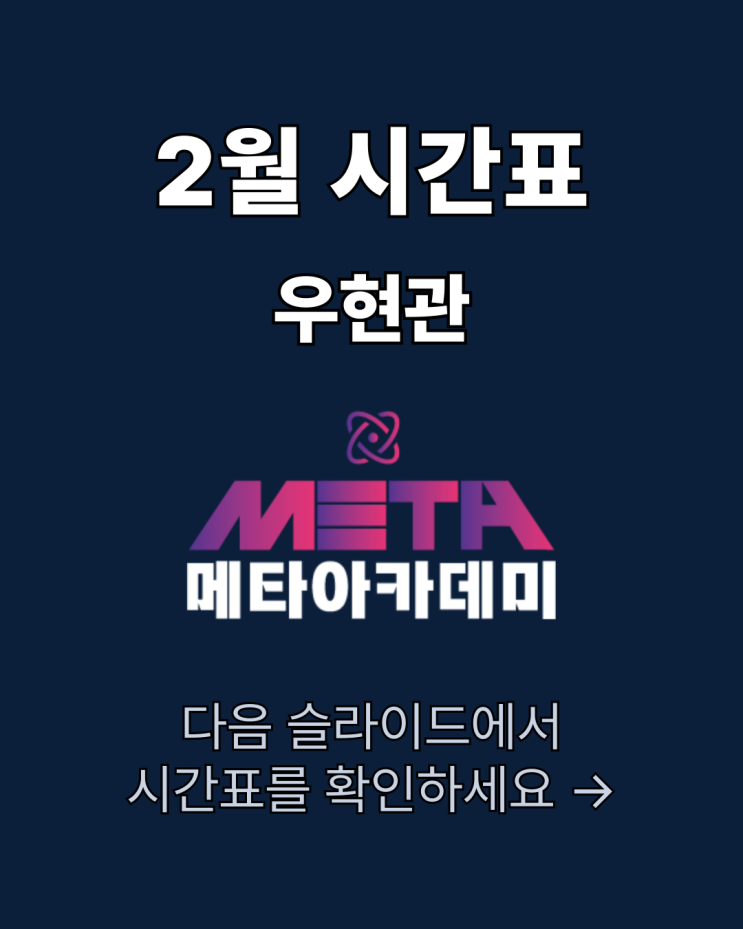 수학, 과학 전문학원 메타아카데미입니다. 2월 시간표가 나왔으니 확인 부탁드립니다. ( 시간표에 없더라도 수업을 원하시면 상담주세요. ) <img src="https://blogthumb.pstatic.net/MjAyNjAxMzBfMzkg/MDAxNzY5NzY4OTc5Njgz.OAFLmtiUfGsTajLwVwqd4pXmkgqIdRLfCX-ZOkFrB4wg.pjW5qlAHczX0Z0LQ82tk72e42lhvHoDdRzgZkf2h91cg.PNG/006.png?type=s3" />