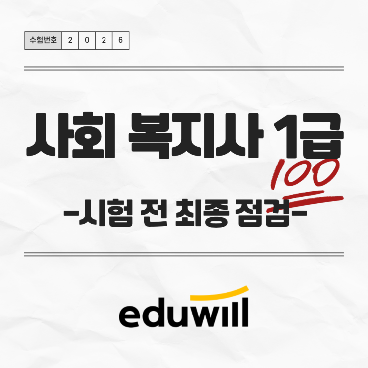 안녕하세요. 에듀윌입니다 사회복지사 시험이 코앞으로 다가왔습니다. 지금 시기에는 시험 당일 실수를 줄이고, 준비물을 정확히 챙기고, 출제 경향을 마지막으로 점검하는 것이 더 중요합니다. 시험 시작 전 마지막 체크리스트! 에듀윌과 함께 점검하겠습니다! 사회복지사 1급 시험은 과목별로 순차 진행됩니다. 시험 시작 이후에는 입실이 불가능합니다. 입실 마감 시간이 엄격하니, 최소 30분 이상 여유 있게 도착해 안정적으로 준비하는 것이 좋습니다. 사회복지사 시험은 한국산업인력공단(HRD)에서 주관하며, 시험장 관련 안내는 공단에서 제공하는 공지에 반드시 따라야 합니다. 시험 전에 시험장 위치와 교통편을 미리 확인해 두....... <img src="https://blogthumb.pstatic.net/MjAyNTEyMThfMTQ3/MDAxNzY2MDM0MTgyODgz.F8PY_OdNQAQ3bNhkTUB2WNJTG7Uf721rT02VsGBeRWUg.iagN34QRZBU0kZ9A1oGY56NkYUg59kUKDdZhx9Sk3MQg.PNG/001.png?type=s3" />