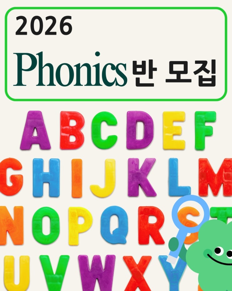 7세 정규반(예비 초등반) 신규 개강 안내드립니다. 영어 알파벳부터 ‘스스로 읽고 말하는 힘’을 차근차근 키워드립니다. 2026년에는 주 2회, 1시간 수업으로 기초를 탄탄히 다지고 아이의 발달과 수준에 맞춰 점차적으로 수업 시간이 늘어납니다. -어떤 수업인가요? 알파벳 – 파닉스 – 기초 읽기까지 빈틈 없이 영어로 진행되는 간단한 인사등 회화표현, 교실 표현, 지시문 이해 영어에 처음 접하는 7세도 부담 없이 따라오는 놀이+체계형 수업 수업 내내 아이들이 영어로 말할 수 있는 환경을 만들어 자신감 & 발화량 UP -실제 성장 사례 제가 11단지 공부방에서 처음 맡았던 7세 학생들이 어느덧 4학년, 곧 예비 5학년이 됩니다. 그 아....... <img src="https://blogthumb.pstatic.net/MjAyNTEyMThfNzAg/MDAxNzY2MDAzNTI3ODQ0.znF15zp_EZyRz-0tbDGfiorGFUhsEbOhPwxq8qzMMYQg.ZsgcdOXFeN-Lz2EDvjscxLGWbVH5l92vH3PnnDY9yR4g.PNG/Yellow_Modern_We_Are_Hiring_(Poster).png?type=s3" />
