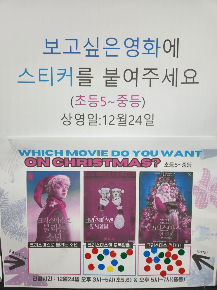 ♠크리스마스 전날 ,친구랑 영화보자♠ TOP뮤엠영어 해법수학학원에서 크리스마스전날 친구를 초대해 함께영화를 보는 시간을 준비했어요. 일시:12월 24일(수) 오후 1시~7시 친구랑 같이 오면 즐거움이 두배!! 맛있는 팝콘을 무한제공해요 ♬♬ 다 함께 웃고 행복한 크리스마스 추억을 만들어봐요~~ 아이들이 보고싶은 영화에 투표를 해보았어요^^ 크리스마스 여러분의 선택은?? ☞크리스마스 연대기, 그해 크리스마스에는 당첨되었어요. 모두모두 12월24일 영화관람 기대해주세요 우리학원은 매년 12월에 아이들과 함께 크리스마스트리를 꾸며요 아이들의 웃음으로 반짝이는 크리스마스트리 ★작은 장식이 모여 큰 크리스마스 트리가 되네요★ 우....... <img src="https://blogthumb.pstatic.net/MjAyNTEyMThfMTMx/MDAxNzY2MDYwNDQ0MTk4.l8PElaaMIyvlJ9krbV_VcwW18gjb_D34C1XlK9-0b90g.Lt9R1ysK1OIU8kK4LYfn_7s9dgf8zbUEHStriFVR_6og.JPEG/20251216_180556.jpg?type=s3" />