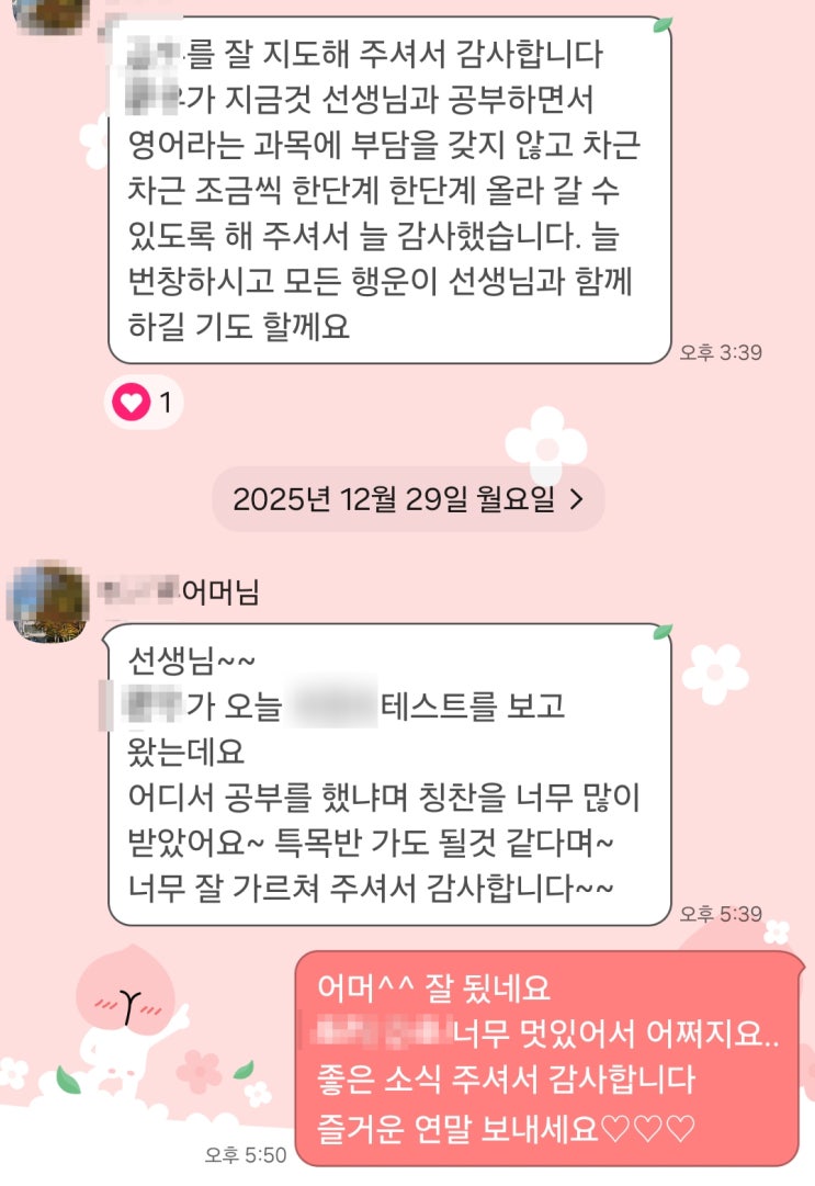 선생님, @@이 레테 보고 왔는데 어디서 영어공부했냐고 칭찬많이 받았어요 특목반 가도 될거같다고 최근 받은 이 학부모님의 메시지가 연말에 저에게 큰 기쁨을 주었습니다. 아울러, 이 학생이 영어나무에서 어떻게 수업을 이어왔는지 돌아보았습니다 22년 3월, @@는 'Easy Link 3'라는 기초 교재로 영어나무 수업을 시작했습니다. 아주 평범한 초등학교 3학년 학생이었죠. @@가 목동쪽 학원으로 다니던 아이들과 달랐던 점은 딱 하나입니다. 영어나무에서의 44개월 '번아웃' 없는 폭주 귀여운 장난꾸러기여서 어디서 줏었는지 모를 나뭇잎이나 열매들을 책상에 놓고 가거나 주머니에 넣어서 뜨끈해진 사탕을 정말 아무말 없....... <img src="https://blogthumb.pstatic.net/MjAyNjAxMDFfMjIy/MDAxNzY3MjY5OTk3MDA2.RxG37WlXdbmMPu4NZ2nkn1yvWXaB3OCdskSRUJjICb0g.6yBoDbHY3OnsAmo3bZaRhhnUk6TVXKVzralRb6Fm8t0g.JPEG/KakaoTalk_20260101_195535602.jpg?type=s3" />