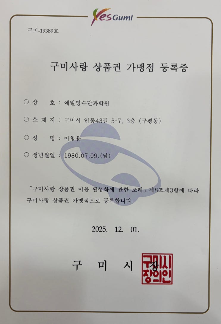 안녕하세요. 예일단과학원입니다. 이제 저희 학원에서도 구미사랑상품권 결제가 가능하다는 점! 안내드립니다 수강료 납부 시 원하시는 방식으로 사용하실 수 있으니 편하게 문의주세요~ 앞으로도 더 편안한 학원 환경을 만들기 위해 최선을 다하겠습니다. 감사합니다 #YALE #YEI #입시학원 #구미입시 #구미단과 #구미영수 #수능전문 #중등 #고등 #학원 #구미구평동학원 #학원블로그 #국어 #영어 #수학 #과학 #구미학원 #산동 #2호점 #예일단과학원 #예이단과학원 #예일학원 #예이학원 #중고등학원 #국영수과학원 #학원소식 #중등국어 #중등수학 #중등영어 #중등과학 #고등국어 #고등영어 #고등수학 #고등과학 #시험대비 #내신대비 #....... <img src="https://blogthumb.pstatic.net/MjAyNTEyMTJfNTUg/MDAxNzY1NTI4OTcwNzQ5._VmhJT_1GoDJdk6cQmjyn2-WJ5fz7RLfQ0VvvfI7QTYg.PB3i-QxOO5PbwjLRl5B_fh7_zLvli_buKBlzRRVq8l8g.JPEG/KakaoTalk_20251212_174023266.jpg?type=s3" />