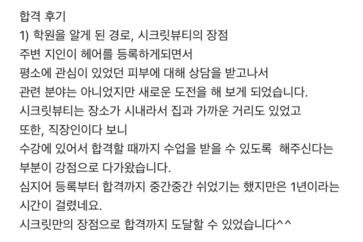 고 경 이 님 합격을 진심으로 축하드립니다^^ 소중한 수강후기 정말 감사합니다^^ -시크릿뷰티미용학원- <img src="https://blogthumb.pstatic.net/MjAyNjAyMTBfMTc2/MDAxNzcwNjg0NjUyNjMw.mFMuZaJvB5Drdsmnb7janiXeQTgFIOD3TTavp5QHgq4g.smnzl0Zwe3MBlXU4WnzeEHl12TzuV1S8ZaHMXRKvR_8g.PNG/KakaoTalk_20260210_094815142.png?type=s3" />