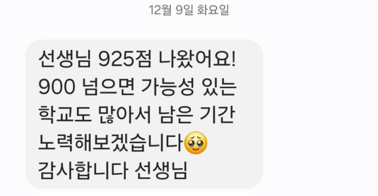 [주의캠페인: 인터넷에는 검증되지 않은 토익강의 광고가 넘쳐납니다. 이형규토익의 모든 후기는 실제학생실제성적입니다. 이형규토익은 정직합니다.] 저에게 오는 많은 학생들은 저마다 사연들이 있습니다.그런데 저에게 상담오면서 하는 말중에서 제가 가장 듣기 싫은말이 있네요 그것은 “선생님이 잘가르친다고 해서 마지막에 지푸라기라도 잡는 심정으로 왔다”라는 겁니다. 이것은 두가지의 의미를 가지고 있습니다. 첫 번째는 지금이라도 와서 다행이다와 두 번째는 처음부터 저에게 왔다면 결과는 분명히 더 나았을 것이다라는 것입니다. 학생들은 자신의 능력을 잘모릅니다. 그래서 토익성적이 안나오면 막연히 자기가 못난탓이다라고 많....... <img src="https://blogthumb.pstatic.net/MjAyNTEyMTBfNzgg/MDAxNzY1MzYxMzM0NDg3.cuQeRF1NooBpdLq7v5RrzSh01Cy1tzCMHS4TfYsU68Ag.9yw4imii4tM5Xv06rzKUKKXJsJgP4XVdXFJJ8SE7hA8g.JPEG/900%A3%DFScreenshot%A3%DF20251210%A3%DF172106%A3%DFMessages.jpg?type=s3" />