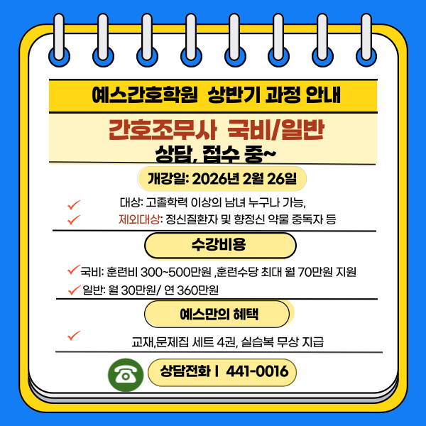 안녕하세요~ 예스간호학원 마스코트 예스입니당~^^ 2025년도 이제 한달도 채남지 않았는데요... 이웃님들은 한해 마무리를 어떻게 하고 계신가요?? 예스는 그동안 함께한 사람들과 만나서 한해 동안의 일상을 나누고 새해에 또 건강과 만남을 이어 가자며 연말 모임의 시간으로 보내고 있답니다~^^ 일명 송년회 망년회~~ㅎㅎ 다가오는 새해에는 올해보다 더 건강하고 행복한 시간 되시길 바랍니당~~^^ 이번 포스팅에는 매 기수 수강생들마다 현장 실습지를 방문하는데요,,,, 현장실습에 대한 내용으로 함께 할게요~~ 1. 현장 실습의 중요성!! 간호학원에서 배우는 이론은 실제 의료현장에서 적용될 때 비로소 완성됩니다. 현장실습은 단순한 임상....... <img src="https://blogthumb.pstatic.net/MjAyNTEyMTFfMjU5/MDAxNzY1NDIyNDI1NDEx.rQ4WINbUfeJpPWlzB9SiiYXdfR6YZ8TY7g9pBwfR-lgg.7ujihQqb2JALgWuOKBFvhtCVECN2DLO9tE8NUY6VQKQg.PNG/2026%B3%E2%B5%B5_%BB%F3%B9%DD%B1%E2_%B0%FA%C1%A4_%B8%F0%C1%FD.png?type=s3" />