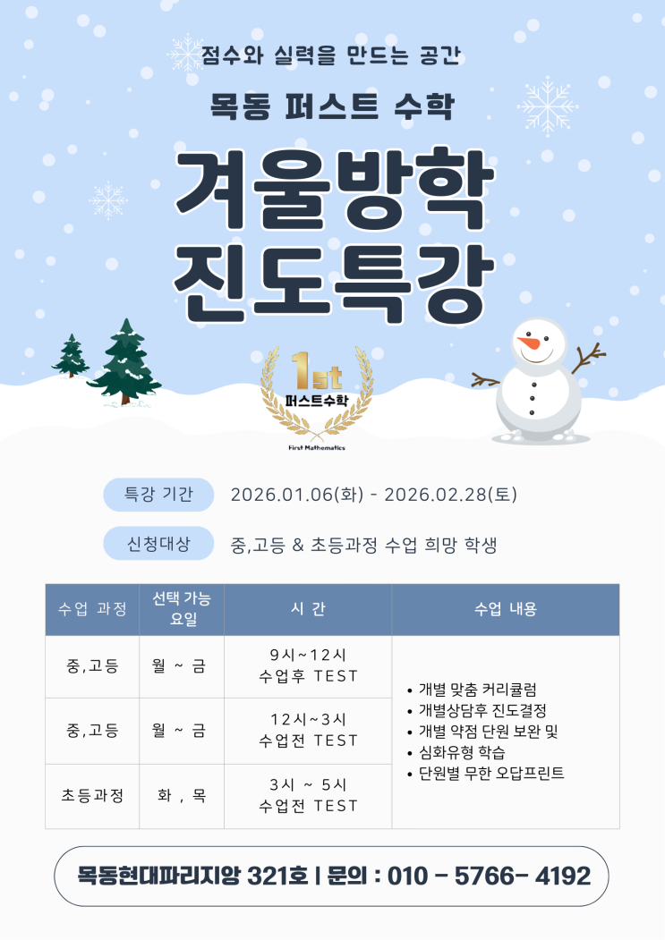 안녕하세요~!! 목동에서 학생들의 수학 실력 향상을 위해 늘 연구하고 노력하는 목동 퍼스트 수학 입니다. 2026년 겨울방학 "이번 방학만큼은 수학 기초와 실력을 제대로 다져보자!" 하는 학생들을 위한 퍼스트수학 겨울방학 8주 특강을 안내드립니다 :) 특강 기간 이번 겨울방학 특강은 2026년 1월 6일(화) ~ 2월 28일(토) 약 총 8주간 진행되며, 특히 목동 개별진도 특강은 퍼스트수학의 강점을 가장 잘 담은 맞춤형 집중 프로그램입니다. * 학교별 겨울방학식이 제 각각이라, 1/6 이후 시작도 물론 가능합니다. * 특강 희망 요일 및 시간을 선택후 신청해주시면 됩니다. 겨울방학, 왜목동 '개별진도 특강' 이어....... <img src="https://blogthumb.pstatic.net/MjAyNTEyMTZfMTE0/MDAxNzY1ODI1NTM1NTkw.2DtNDyZ3qdqicTPBP4x3ZdXHTeMrzol4vO7u49riYsQg.Wim3JN_Uj1-n6iRKrnCmdUWMQin5CHW7LFYax8ASAOAg.PNG/%B8%F1%B5%BF%B0%B3%BA%B0%C1%F8%B5%B5%BC%F6%C7%D0%2C%B8%F1%B5%BF%C6%DB%BD%BA%C6%AE%BC%F6%C7%D0%B0%DC%BF%EF%B9%E6%C7%D0%C6%AF%B0%AD.png?type=s3" />