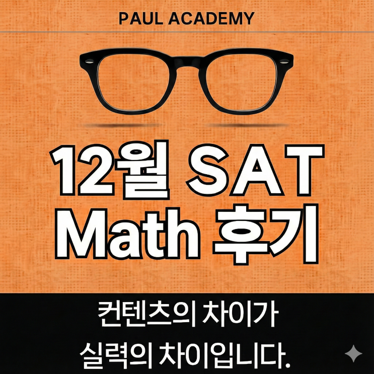 안녕하세요, 폴 아카데미입니다. 2025년 12월 시험으로 올해 SAT 일정이 모두 마무리되었습니다. 이번 글에서는 실제 시험에 어떤 유형의 문제가 출제되었는지 정리하고, 2026년 시험을 준비하는 학생들을 위한 폴아카데미만의 학습 방향을 제시하고자 합니다. 2025년 12월 SAT 수학 시험 분석 이번 12월 시험은 전반적으로 11월 대비 체감 난이도가 평이했다는 평가가 많았습니다. 특히 Module 1의 난이도가 평이했고, Module 2에서 일부 킬러 문제들이 집중 배치된 형태였습니다. 폴아카데미 재원생들의 피드백을 종합한 결과: "11월보다 시간 관리가 다소 수월했어요." "Module 1이 쉬워서 자신감 있게 Module 2로 넘어갔습니....... <img src="https://blogthumb.pstatic.net/MjAyNTEyMTZfMjQy/MDAxNzY1ODYxNjcyNDAw.MvW7gR2XVB0DIY-rMtnLPRcyVUCI8KDWsqHx_SP1j44g.gMx4rv6ZDEMsH-C-gyEVzs2uGDXFHfXGeELZmbwFRXMg.PNG/Gemini_Generated_Image_p3r0yap3r0yap3r0.png?type=s3" />