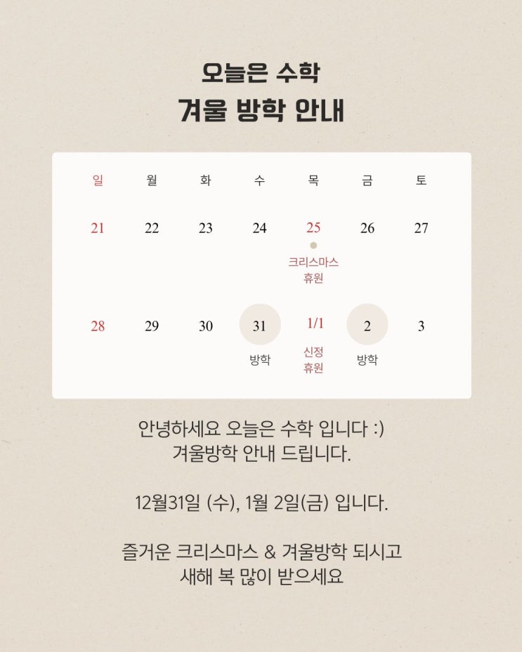 곧 겨울방학이 시작 됩니다. 겨울 방학은 지금까지 해오던 것들을 계속해서 진행하면서, 지난것을 되돌아 보아야하는 중요한 시기입니다. 각자 원하는 목표가 다를때 필요한 내맘대로 특강을 시작합니다. 방학기간 1.2월안에 해내고 싶은 목표를 정해서 신청해주세요. 특히 지금 학원에는 중1 첫 내신시험을 마치고 부족함을 느꼈던 학생과 학부모님들 문의가 많습니다.진도는 저만큼 나가있는데, 왜 중1 시험에서 점수가 나오지 않는걸까.. 하는 고민들이 많으신것 같습니다. 1.2월 다시 지난과정을 다져보고 미리 내신을 준비하는 시간. 고등입학을 앞두고, 공수1.2 심화를 다지고 싶은 학생. 미적분을 한번 훑고 가고싶은 학생 등등 , 원하는.......