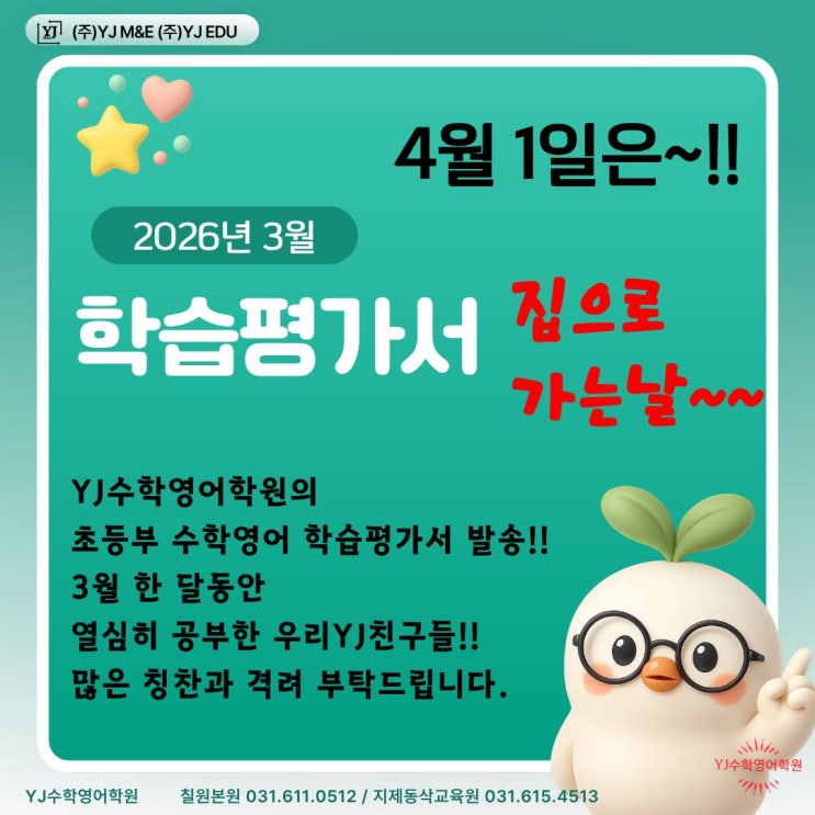 #칠원동영수학원 #동삭동영수학원 수학영어과하전문 YJ수학영어학원입니다. 4월1일은 만우절이 아닌!! YJ수학영어학원 학습평가서가 발송되는날~^^ YJ수학영어학원 칠원본원 / 지제동삭교육원 초등부 수학영어 학습평가서가 4월 1일 가정으로 발송됩니다. 3월 한 달동안 우리 YJ초등부친구들이 열심히 공부한 수학과 영어~ 학부모님들께서도 우리 친구들이 공부한 내용들 꼼꼼하게 확인해보시고 우리 친구들의 학습도 점검해보시는것이 꼭!! 필요합니다. 3월 한 달 동안 열심히 공부한 우리 YJ친구들 많은 격려와 칭찬 부탁드립니다.!! <img src="https://blogthumb.pstatic.net/MjAyNjAzMzFfMzMg/MDAxNzc0OTUyMzkwNTQ2.jbzRod40dwGxiZsiO3Qc8vRSdX0iIBxYeL2VjkV4P68g.13OOAn4b97KkvCO4uQDUQmDxgpfhBEbPMoWJy7iL3xwg.JPEG/%C1%A6%B8%F1%C0%BB_%C0%D4%B7%C2%C7%D8%C1%D6%BC%BC%BF%E4._%2828%29.jpg?type=s3" />