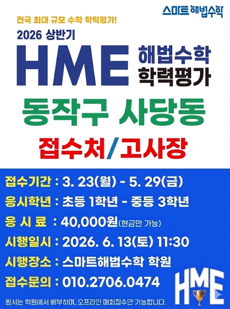 #신남성초 #사당중 #상도중 #해법수학 #사당동수학학원 #수학학원 #사당동초중수학 #스마트해법수학 #HME #학력평가 [공지] HME 해법수학 학력평가 응시 안내 안녕하세요! 우리 아이의 현재 수학 실력을 확인하고, 앞으로의 학습 방향을 설정할 수 있는 HME 해법수학 학력평가를 실시합니다. 교과 과정을 얼마나 잘 이해하고 있는지 점검해 볼 수 있는 좋은 기회이니 많은 참여 부탁드립니다. ️ 시험 개요 * 응시 대상: 초등학교 1학년 ~ 중학교 3학년 * 평가 범위: 해당 학년의 1학기 수학 교과 과정 * 평가 내용: 계산력, 이해력, 추론력, 문제해결력 등 4개 영역 (총 25문항) * 평가 시간: 60분 ✅ 체크포인트 * 객관적 지표 제공: ....... <img src="https://blogthumb.pstatic.net/MjAyNjA0MDRfOTUg/MDAxNzc1MjYxNDQ5NDcw.Ky3g3BXqs7j-GgYSdnUsffIJMlDZnZ_hu9RizAbre1Ug.T_TvG0DBILAgO6cjR25wfHjNwA04WzAvWXkEUFFzqh8g.PNG/image%A3%DF061833d2%A3%AD7743%A3%AD4ba5%A3%ADb7b9%A3%ADa2f2c1732aa5.png?type=s3" />