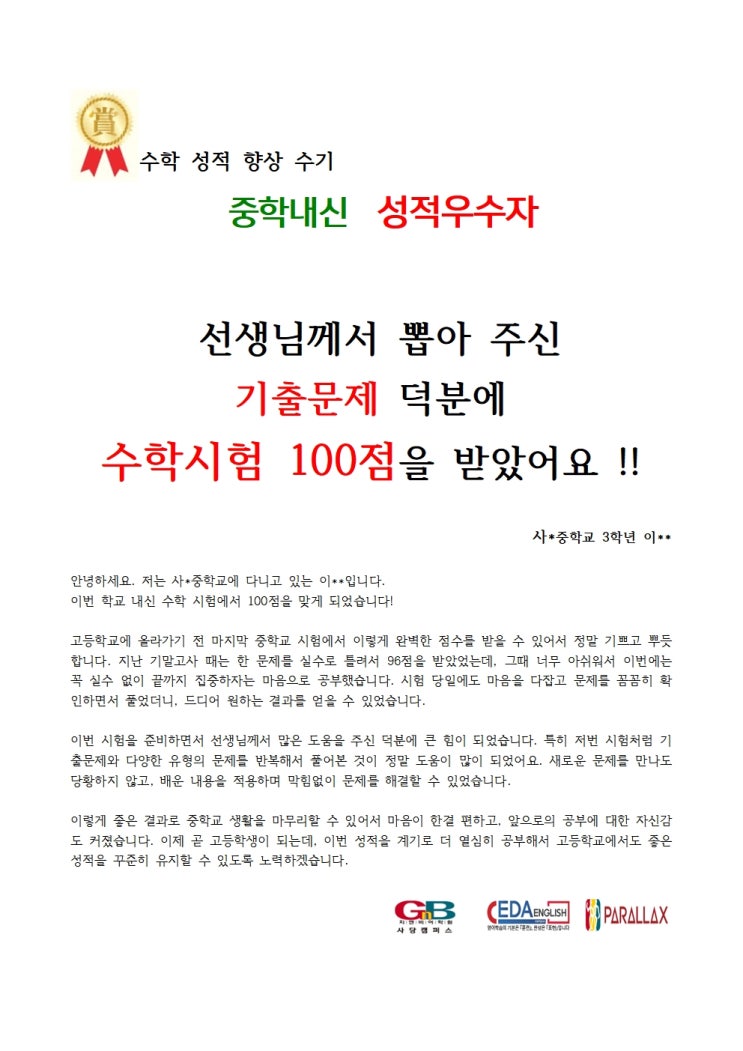 #영어학원 #초등영어 #중등영어 #고등영어 #초등수학 #중등수학 #고등수학 #사당영어학원 #남성초 #신남성초 #행림초 #남사초 #삼일초 #사당중 #남성중 #상도중 #동작고등학교 #경문고등학교 #남성역영어학원 #두산위브 #롯데캐슬 #영어전문학원# 수학학원 # 수학내신 수학 성적 향상 수기 중학내신 성적우수자 선생님께서 뽑아 주신 기출문제 덕분에 수학시험 100점을 받았어요 !! 사*중학교 3학년 이** 안녕하세요. 저는 사*중학교에 다니고 있는 이**입니다. 이번 학교 내신 수학 시험에서 100점을 맞게 되었습니다! 고등학교에 올라가기 전 마지막 중학교 시험에서 이렇게 완벽한 점수를 받을 수 있어서 정말 기쁘고 뿌듯합니다. 지난 기말고....... <img src="https://blogthumb.pstatic.net/MjAyNTEyMjJfMjI3/MDAxNzY2MzkwMzM3Mzkx.C4Pp1K7ZbjasHR3LcIZLCqnPueIsmz3N1HoGR6Bjvsog.nIiDnEqxNgDqHzgt-8IRQzL20uqm3S2z_BeaCsBk_K8g.JPEG/%C8%C4%B1%E2%C0%CC%C5%C2%B0%E625001.jpg?type=s3" />