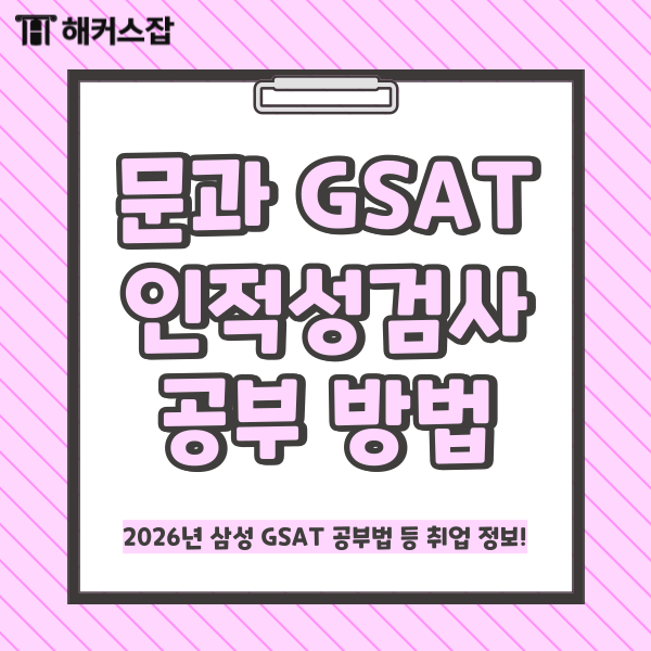 안녕하세요! 해커스잡입니다. 벌써 2025년도 얼마 남지 않았습니다. 오늘은 2026년 삼성 채용을 대비해 문과생이 GSAT 필기시험을 준비한 방법을 소개해 드리려고 합니다. 그럼 지금부터 저와 함께 GSAT 필기시험 공부 방법을 하나씩 살펴보겠습니다! 문과 합격생의 GSAT 온라인 인적성검사 공부법! 간단한 자기소개! 저는 삼성 SDI 경영지원 부문에 합격한 지원자입니다. 학부에서는 일본어와 중국어를 복수 전공했고, 교환학생 경험은 없습니다. 이전에는 일본계 회사에서 영업직으로 근무한 경험이 있으나 1년 미만이어서 큰 경력으로 없었습니다. 그리고 하반기 지원이 첫 지원이었는데, 운 좋게 합격할 수 있었어요. 그럼 다음으로 합격 스....... <img src="https://blogthumb.pstatic.net/MjAyNTEyMjJfNzQg/MDAxNzY2MzcwMzA5NjA5.r8IEAwsgNeuf80GBr8RjaCANGqerJ8q9gurol10aUMcg.thvoGw7i6DMRrvNZAmhnpXvIpRWtY2X0sNC3E286WoIg.PNG/001.png?type=s3" />