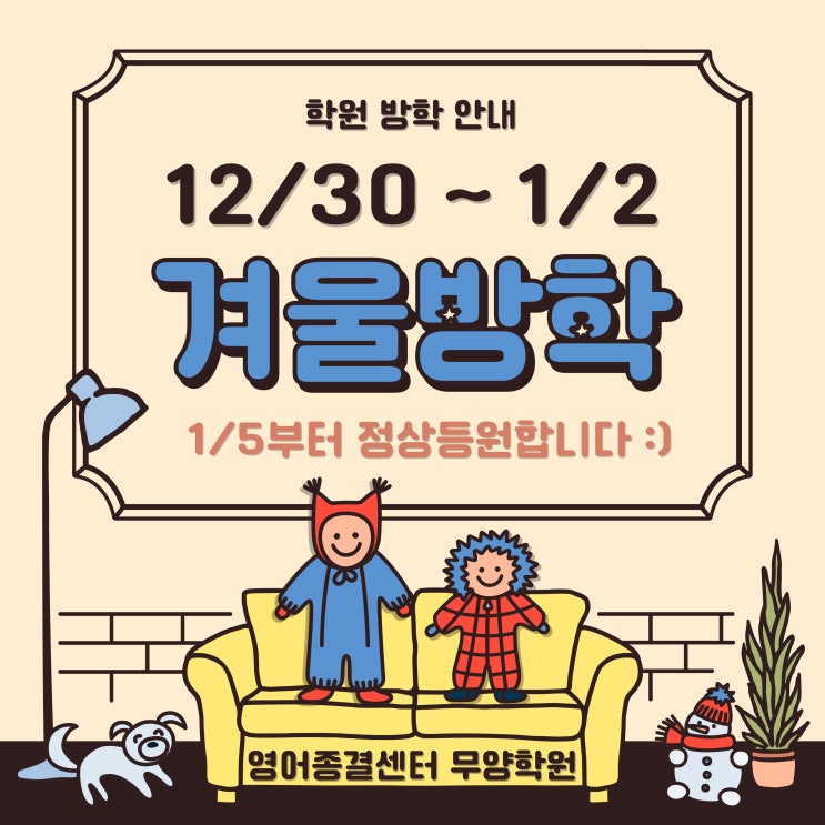 안녕하세요 영어종결센터 무양학원입니다. 이제 2025년이 정말 얼마 남지 않았는데요.. 겨울방학이 다가오는 만큼 영종이들에게도 휴식이 필요하겠죠? 오늘은 학원 방학 일정을 알려드리려 합니다. 연말은 가족, 친구와 함께 행복한 시간 보내고 2026년엔 새로운 마음가짐으로 더 열심히 하는 영종이들이 되어 보아요! #상주학원 #영어종결센터 #영어학원 #방학 #예비중등 <img src="https://blogthumb.pstatic.net/MjAyNTEyMTlfNiAg/MDAxNzY2MTI5MDk3NjQx.O0t2ViPpu-cKxlJ6S5hwv5ourv0RgzeEJRVvoc-FXLwg.7T5KPGFW-s64xTo26SLn9BxOQMZeVt-AUw-icHGOGCUg.JPEG/%B0%DC%BF%EF%B9%E6%C7%D0.jpg?type=s3" />