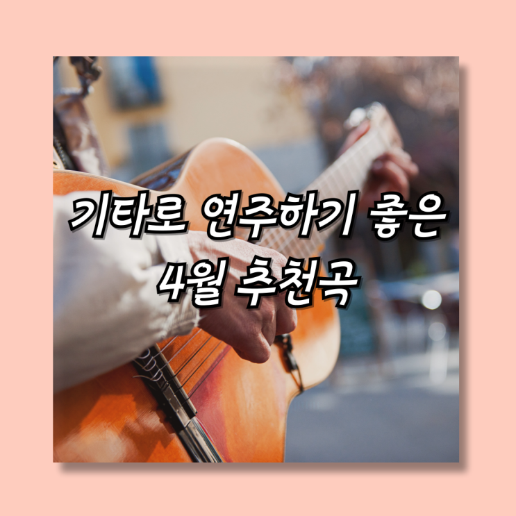 봄에 연주하기 좋은 기타곡 5곡 따뜻한 햇살과 함께 봄이 시작되는 4월은 새로운 취미를 시작하기 좋은 계절입니다. 특히 기타는 가볍게 들고 연주할 수 있고 좋아하는 노래를 직접 반주할 수 있어 취미 악기로 많은 사랑을 받고 있습니다. 오늘은 4월에 연주하기 좋은 기타곡 5곡을 소개해보려고 합니다. 1. 고백 – 델리스파이스 봄 하면 떠오르는 대표적인 기타곡입니다. 경쾌한 분위기와 밝은 멜로디가 봄과 정말 잘 어울리는 곡입니다. 코드 진행도 비교적 단순해서 통기타를 처음 배우는 분들이 연습곡으로 많이 선택하는 곡이기도 합니다. 특히 스트로크 패턴을 연습하기에 아주 좋은 곡입니다. 2. 너에게 난 나에게 넌 – 자전거 탄 풍경....... <img src="https://blogthumb.pstatic.net/MjAyNjAzMTVfOTYg/MDAxNzczNTY1MDY2NjA2.Dn2mjlDPsiSHuBfuy1txYL5tJUIvUg6reuFHgt2S03Eg.N6TZ98vbzhronPaKFk6P2-J02P8t6R_d-ZlH1YKgQFIg.PNG/004.png?type=s3" />