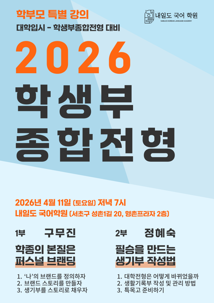 퍼스널 브랜딩 기반 학생 설계 중학생 시기에 반드시 잡아야 할 핵심 전략! 변화된 입시 흐름에 맞춘 준비 방향과 중등 생활기록부 관리 방법, 그리고 특목고·자사고 진학까지 고려한 실질적인 로드맵을 안내합니다. 일시 : 4월 11일 (토) 저녁 7시 장소: 내일도 국어학원 2층 #학생부종합전형 #중등논술 #우면동논술학원 #우면동국어논술 #영동중국어학원 #우면동국어학원 #서초네이처힐국어논술 #국어논술전문학원 #중고등국어논술 #고등국어 #우면동고등국어 #양재고내신 #언남고내신 #서초고내신 #영동중내신 <img src="https://blogthumb.pstatic.net/MjAyNjAzMjNfMjE0/MDAxNzc0MjMyNDg0NDM4.yZUrbqrxS57mwNoisIARf4PB6f974nZz21gT7IzEfdMg.PAgcr9hGGefz1ReU9mYpoR3uVhcXcevEVBO1MpXLGlog.PNG/%B0%AD%C0%C7_%C6%F7%BD%BA%C5%CD_%B4%EB%C7%D0%C0%D4%BD%C3_-_%C7%D0%BB%FD%BA%CE%C1%BE%C7%D5%C0%FC%C7%FC_%B4%EB%BA%F1%B9%DD.png?type=s3" />