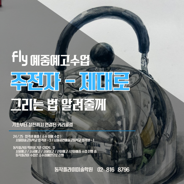 LET'S FLY WITH FLY 안녕하세요!! 동작플라이미술학원입니다 날씨가 많이 추워졌어요. 감기에 걸리지 않게 건강관리에 힘써주시길 바래요.~~ 오늘은 우리 학생들이 어려워하는 금속 주전자(스테인리스)를 그려 보았어요. '반짝반짝 주전자 ' 단계별 과정을 소개해 드려요~. 금속 주전자는 예중, 예고 입시에서 없어서는 안 될 중요한 소재인데요! 금속은 반사와 비침이 함께 존재하기 때문에 쉬울 것 같지만 오히려 까다롭다고 느껴지는 정물이에요. 사실 모든 정물이나 사물에는 미술의 핵심 원리가 다 들어가 있어요~ 아이들이 가장 많이 하는 질문, 선생님, 반짝이는 주전자 도대체 어떻게 저렇게 입체적으로 그려지는 건가요....... <img src="https://blogthumb.pstatic.net/MjAyNjAxMTNfMTk0/MDAxNzY4Mjk5NjEwODcy.II2e0Qdb8ykV3bebz10rK3EdH50TBqjHMwPnLlBxp_0g._dIEbmXoA8VuK6NDyRKoO5oFNSunBl8Chlz8bkcjqmAg.PNG/%C1%D6%C0%FC%C0%DA.png?type=s3" />