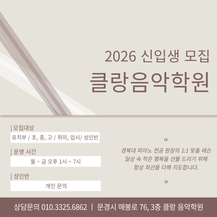 [문경 피아노학원/ 문경 음악학원] 2026 클랑 음악학원 신입생 모집