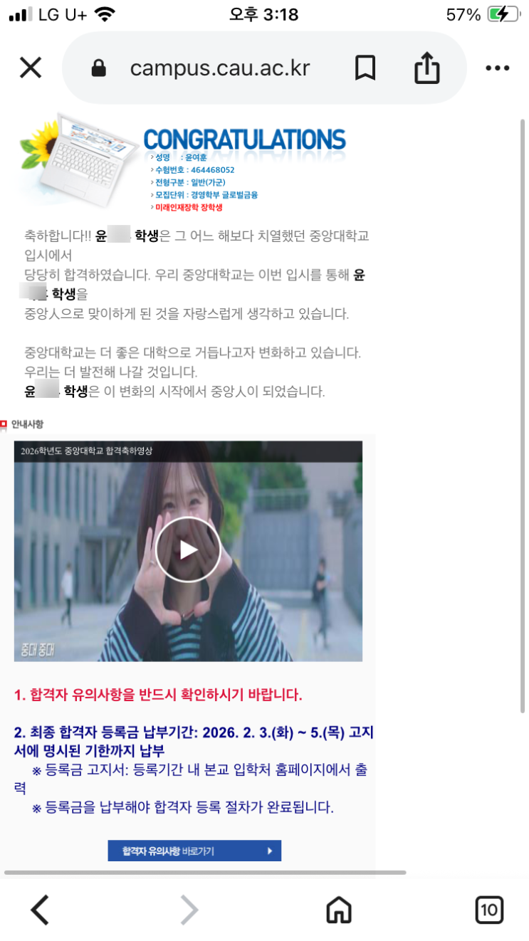 또 한명의 입시 결과를 진심으로 축하합니다! 정이조 영어학원에서 무려 강서 주니어부터 다니기 시작해 고등학교 3학년까지 완주한 우리 윤OO학생!! 학원의 원장님부터 선생님들이 모두 다 성장과정을 함께 보아 온 윤OO 학생의 가군 중앙대 합격을 축하합니다! 강서주니어에서 재미있는 영어학습과 함께, 원어민 선생님들과 함께 공부하며 영어에 대한 기본 감각을 깨우고! 우장산 캠퍼스에서 초등학교 6학년, 중1 을 거치며 영어의 핵심! 기본 문법을 탄탄하게 다지며 올바른 독해, 영어를 제대로 읽는 능력을 길러낸 뒤 중2, 예비고를 거치며 지문을 읽는 능력과 논리적으로 파악하는 능력을 착실히 키워 온 우리 윤OO 친구는 명덕고 학교 내....... <img src="https://blogthumb.pstatic.net/MjAyNjAxMTRfNjUg/MDAxNzY4Mzc0MDM3Nzcw.v5V3M9m5E8TGIAmiLfMKZIewkjlRd31qP11jWeJZtN0g.8b8olqhs8i735QgA2gUIf1ys3n0OKXSxslvuj90k4Xog.PNG/KakaoTalk_20260114_151854485.png?type=s3" />