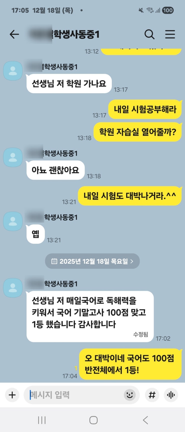 안녕하세요? 경산 사동에 있는 초등영어학원 경산 사동에 있는 중등영어학원 경산 사동에 있는 고등영어학원 사동 다니엘 영어학원입니다. 안녕하세요! 사동의 교육 소식을 가장 깊이 있게 전하는 다니엘샘샘입니다. 오늘은 정말 가슴 벅찬 소식을 들고 왔습니다. 우리 경산 사동중학교 1학년 학생 중 한 명이 이번 시험에서 놀라운 결과를 가져왔거든요. 국어 100점은 물론, 전 과목에서 고른 고득점을 기록하며 반에서 1등을 차지했다는 소식입니다! 단순히 '공부를 열심히 했다'는 말로는 부족한 이 학생의 비결, 궁금하시죠? 그 중심에는 바로 [매일국어]를 통한 문해력의 힘이 있었습니다. 1. 모든 공부의 시작은 '읽기'....... <img src="https://blogthumb.pstatic.net/MjAyNTEyMThfMjgg/MDAxNzY2MDQ2MzIwODAy.ZlZ-1ZG5IX78XXApiR7i_B_fLufbaaV62Ms6aCONLHIg.eYpghAehu6cf7yP7hUbvy1fu6UXuWlrrmyCaMGwwL20g.JPEG/900%A3%DFScreenshot%A3%DF20251218%A3%DF170500%A3%DFKakaoTalk.jpg?type=s3" />