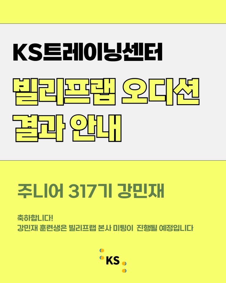 강남오디션연기학원 KS트레이닝센터 빌리프랩 소속사오디션 결과 안내 ✔ 5개 과정, 13개 과목으로 세분화된 커리큘럼 ✔ 정기적인 드라마, 영화, 오디션 및 캐스팅 기회 ✔ 체계적인 매니지먼트팀의 배우 케어 오디션을 준비하는 이들에게 필요한 모든 것이 갖춰져 있는 강남오디션연기학원 KS트레이닝센터 입니다 :) KS트레이닝센터 강민재 훈련생이 지난 주 KS트레이닝센터에서 열린 빌리프랩 소속사오디션에서 합격해 본사 임원 미팅이 진행됩니다 어리지만 열정 넘치는 강민재 훈련생의 오디션! 앞으로도 잘 준비해 좋은 결과 내기를 바랍니다 강남오디션연기학원 KS트레이닝센터는 ✔ 체계적인 연기교육 ✔ 탄탄한 연기기초 ✔ 폭 넓은 특....... <img src="https://blogthumb.pstatic.net/MjAyNjAxMjBfNjgg/MDAxNzY4OTAwNDEzODU3._qtncVRDmhKutxvC6HMbMjJZ2C66PNWJTHg-qaQB-i0g.oWMpLEYQ8g6y5c0DqhJHGUceHwLou75iSJzQNbeKLfMg.JPEG/%C1%A6%B8%F1%C0%BB_%C0%D4%B7%C2%C7%CF%BC%BC%BF%E4_%2816%29.jpg?type=s3" />