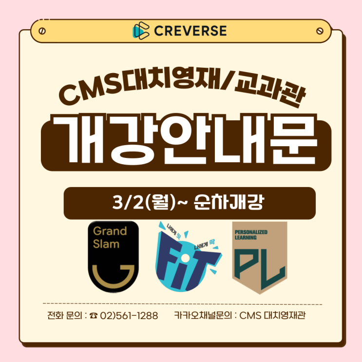대치영재교과관 2026년 3월 개강(3/2~) 정규 GS TOP 반 S 초등고학년 과정 Bloomath 초등저학년 과정 정규 Grand Slam 예비반 Personalized Learing 개별진도 FIT 프로그램 입니다. 3~5월 개강(3개월) GS TOP 정규 프로그램 3~5월 개강(3개월) 초등 S 프로그램 (프리미엄관 런칭★) 3~5월 개강(3개월) 초등 BM 프로그램 (프리미엄관 런칭★) 3~4월 개강(2개월) GS 정규 프로그램 (2개월/3개월) PL 개별진도 프로그램 3~5월 개강(3개월) GST 프로그램(사고력관 연계) 3~5월 개강(3개월) FIT 프로그램 (수업 일정은 변동 될 수 있습니다. 참고 바랍니다!) ◈ 초등 교과관 프리미엄관 프로그램 안내 ◈ (프리미엄관은 도곡로 456, 6층에서 수업 진행....... <img src="https://blogthumb.pstatic.net/MjAyNjAyMTBfMjA5/MDAxNzcwNzAyOTYwMDQw.cLUk4n987bwuPEIKp6QmyiXGPmgfB3CrewSLUlLXEB4g.U3Gq3XpPOjrGbA572svpKAeh0D1VabOKp4Ez_ThGiJYg.PNG/%B0%B3%B0%AD%BE%C8%B3%BB%B9%AE-003.png?type=s3" />