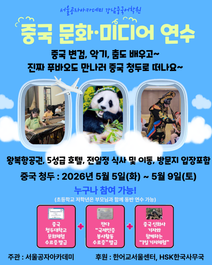 주제가 있는 연수 무대 위에서 단숨에 얼굴이 바뀌는 변검, 몸으로 리듬을 읽는 중국 전통 춤, 중국 악기와 노래 체험, 그리고 카메라 앞에서 뉴스를 전하는 중국 아나운서 체험, 한국에서 태어나 많은 관심을 받은 진짜 "푸바오"를 만나고 신화사 기자에게 직접 사진 찍는 법을 배우는 현장 체험, 중국 청두대학교 문화체험 수료증+판다 "국제인증 봉사활동 수료증" 수여 중국 문화는 책으로만 배울 수 있을까요? 우리는 이 질문에서 이번 연수 프로그램을 시작했습니다. 무대 위에서 단숨에 얼굴이 바뀌는 변검, 몸으로 리듬을 읽는 중국 전통 춤, 중국 악기와 노래 체험, 그리고 카메라 앞에서 뉴스를 전하는 중국 아나운....... <img src="https://blogthumb.pstatic.net/MjAyNjAyMTBfMjM4/MDAxNzcwNzA2NTk1OTA4.FnwHCo_iJdkxDAwjldpRC43CpxRZ7tausyMoE8NKe58g.UlpbM0juKcvLQLA3jIevzHGTc3GAhhGTmTgzNHy8c1Yg.PNG/%C1%A6%B8%F1%C0%BB_%C0%D4%B7%C2%C7%D8%C1%D6%BC%BC%BF%E4.-_%BA%B9%BB%E7%BA%BB.png?type=s3" />