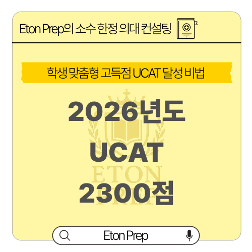 안녕하세요~ Eton Prep입니다! 의과대학의 열기가 식지 않는 만큼 학생들과 학부모님들의 UCAT 고득점 받기에 대한 열정은 계속되어가고 있는데, 오늘 포스팅할 내용은 UCAT 점수가 쉽게 오르지 않는 학생들에게 도움이 될만한 내용인 거 같습니다! 모두 알다시피 UCAT 시험은 단순한 지식형 시험이 아니라 짧은 시간 안에 사고력, 판단력, 속도, 정확도를 동시에 요구하는 고난도 적성 시험입니다. 특히 경험상 많은 학생들이 어려움을 겪는 구간은 문제를 이해하는데 시간이 오래 걸림 시간 압박으로 인해 후반부 정확도 급감 Verbal Reasoning 점수 정체 연습량 대비 실전 점수 상승 폭이 미미함 저희 학원에서 UCAT을 배우는 학생 중 한 명 또....... <img src="https://blogthumb.pstatic.net/MjAyNjAyMTBfMjcg/MDAxNzcwNzA5MTY4MDQ4.BtOjKUFCcVOrGqcvOc3ecp3XxQwGKfOfAKlWm6y9FrQg.ZwLLCg9-ibN2ZdYUjh1MgWuHRswEUxIOrtnaRueazCgg.PNG/2300%C1%A1.png?type=s3" />