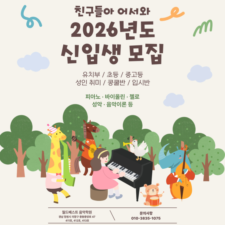 안녕하세요, 월드베스트 음악학원입니다 새롭게 시작되는 2026 신학기, 우리 아이의 음악 성장을 책임질 학원을 고민하고 계신가요? 월드베스트는 창원 지역에서 전체대상·대상 수상자를 다수 배출한 학원으로, 수상 실력뿐 아니라 탄탄한 기본기·무대 경험·즐거운 배움을 함께 키우는 교육 시스템으로 인정받고 있습니다. 월드베스트가 특별한 이유 ✔ 정밀 10분 단위 시간표 운영 아이 한 명 한 명에게 최적의 레슨 시간을 보장하기 위해 모든 시간표를 10분 단위로 세밀하게 관리합니다. ✔ 정원 제한 + 담임제 1:1 맞춤 수업 레슨이 불규칙하거나 선생님이 자주 바뀌는 구조가 아닙니다. 한 명의 담임 선생님이 처음부터 끝까지 책....... <img src="https://blogthumb.pstatic.net/MjAyNTEyMTVfODcg/MDAxNzY1Nzg5OTk4MTEx.Z94-s1QIqTq--k1rIWNKvLj7i3oMhnKVeEHuyPquzOYg.icvdhoyNxSaIqEs6nH4rQ33o2-bsKshHsqWk1AyY6wwg.PNG/%C5%DB%C7%C3%B8%B4-%B0%C7%BF%EC%B2%A8-081.png?type=s3" />