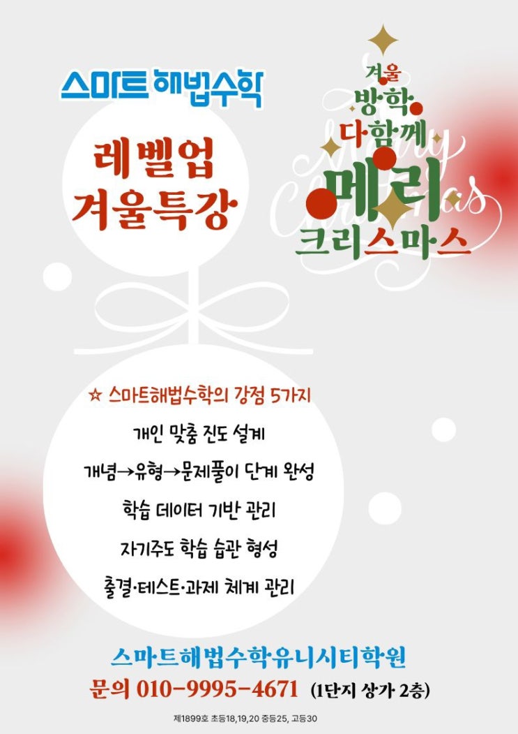 안녕하세요. 스마트해법수학 유니시티학원입니다. 스마트해법수학학원은 해법수학 진단 테스트 결과를 바탕으로 하여 초중고 1대1 수준별 맞춤 개별 수업으로 운영하고 있습니다. 수학 학습에서 가장 중요하게 보는 요소는 개별 맞춤 학습과 오답 클리닉 시스템입니다. 스마트 해법수학 유니시티학원은 이 두가지를 가장 완벽하게 해결해주는 시스템으로 수업합니다. 아이들은 저마다 다른 수학적 두뇌를 가지고 있는데, 이를 성장시키기 위해 개별 맞춤학습이 꼭 필요합니다. 스마트해법수학의 교재는 모두 다릅니다. 100명의 아이들이 있다면 100권의 교재가 있다는 뜻입니다. 각자의 레벨, 진도, 오답, 연산, 개념, 서술형, 심화, 사고력 등 학....... <img src="https://blogthumb.pstatic.net/MjAyNTEyMTdfMTIw/MDAxNzY1OTY5OTIxNzYw.OECBK9AkEOZ3gn7RvoKVl3S1GryAHULk3zlmAjoyZQUg.ixC5faZkmn8GOAVrF9hmnHydrmstGdW3U5wIOJP74F4g.JPEG/1763799118486.jpg?type=s3" />