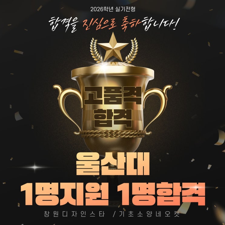 026 울산대 디자인융합학부 1명 지원 1명 합격!! 합격을 축하합니다. 모든 합격자는 창원 상남동 디자인스타미술학원 수강생 입니다 <img src="https://blogthumb.pstatic.net/MjAyNjAyMDJfMjQg/MDAxNzcwMDQzMDExOTEx.UYRWf52vDHIyLyw4Vf_IjGL8bmpXGEx-j8njhfzKIOAg.V_SAqosgL_-hoxnfGXgV8j4IvXQw4KnMvyZp19fUYZsg.JPEG/%BF%EF%BB%EA%B4%EB_%C7%D5%B0%DD.jpg?type=s3" />