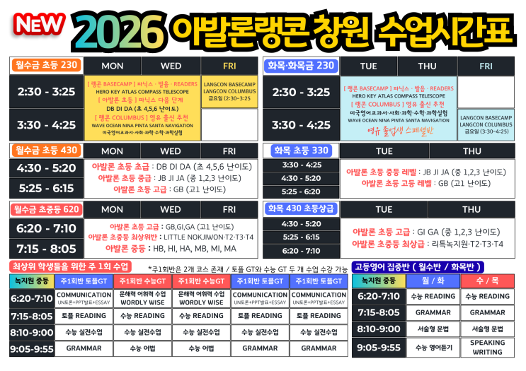 아발론 랭콘 창원어학원 2026 봄학기(3~5월) 수강신청 시작 안내 안녕하세요. 아발론 랭콘 창원어학원입니다 어느덧 새 학기를 준비해야 할 시기가 다가왔습니다. 아발론 랭콘에서는 2026년 봄학기(3월~5월) 수강신청을 시작하며, 이에 따른 교재 구매 및 수강료 결제 일정을 안내드립니다. 2026 봄학기 안내 학기 기간: 2026년 3월 ~ 5월 교재 구매 기간 2월 5일 ~ 2월 18일 구매한 교재는 본사에서 학생별로 따로 배송을 진행합니다. 3월 학기 전에는 교재 주문이 많이 몰리는 시기입니다. 따라서 새 학기 이전에 교재 주문이 반드시 필요하며, 기간 내 결제가 이루어지지 않을 경우 교재 수급에 차질이 생길 수....... <img src="https://blogthumb.pstatic.net/MjAyNjAyMDVfMjE2/MDAxNzcwMjc5ODU2MzM2.LZoT-gfIwtQ8vZTLe6K61ZFSIpNaWad7Tzv4RuQqi1gg.3Z_AXw9u6W0pmCU_03wQ6V2vwXpJivEaAyUGIMdYeW0g.PNG/25%B3%E23%BF%F9_TIMETABLE_%284%29.png?type=s3" />