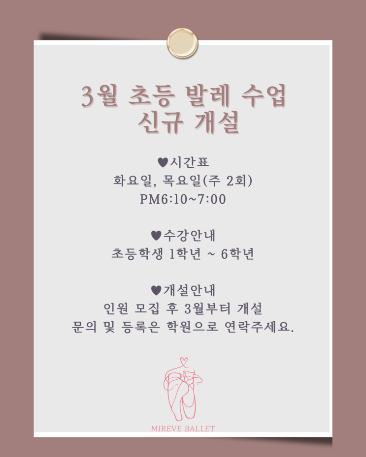 3월 초등발레 수업 신규개설 ✔️수업시간: 화요일, 목요일 (주2회) pm6:10-7:00 ✔️수강안내: 초등학생 1학년~6학년 수강가능 ✔️개설안내: 인원모집 후 3월부터 개설, 등록순 수강가능 문의사항은 아래로 연락주세요 Mi reve Ballet academy 발레, 현대무용 취미·입시 전문학원 ✔성인취미발레, 성인현대무용, 성인발레핏(발라레필) ✔유치부발레, 유치부현대무용(6~7세) ✔초등부저학년 발레, 현대무용 ✔초등부고학년 발레, 현대무용 ✔중등부 발레, 현대무용 ✔고등부 발레, 현대무용 [상담안내] 상담문의 | 010.5733.2950 카카오톡 채널 | 미레브발레아카데미 카카오톡 상담문의 | http://pf.kakao........ <img src="https://blogthumb.pstatic.net/MjAyNjAyMDZfMjU3/MDAxNzcwMzU4Njg4NzUz.psC6l1UTEDBz6uK8W6Sea5-gYtOYXALX2hs7oXA46Jkg.YjyUbpg4rrftfwhQVx6dC9dpaDGBu949d8GhiaHIZ04g.PNG/image.png?type=s3" />
