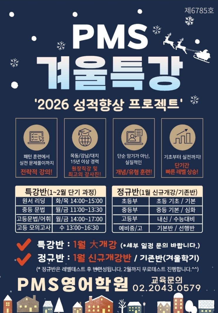 안녕하세요. PMS영어학원입니다. 2025년 한 해가 얼마 남지 않았습니다. 남은 연말 연시 뜻깊고 행복한 마무리 되시길 바라며, 곧 다가올 행복한 2026 병오년(붉은 말의 해)의 시작, 모두가 항상 건강하고 행복했으면 좋겠습니다. 2026년 새해를 맞이하며, 저희 PMS에서는 학생들이 새 학년을 대비하는 보다 알찬 겨울방학을 보내도록 하기 위해 부족한 부분을 채워 가고자, 겨울 방학 특별 집중 강의를 진행할 계획입니다. 이번 특강이 개인의 실력 향상은 물론, 다음 학년을 준비하는 의미있는 시간이 되기를 바랍니다. 겨울방학 단기 특강 관련 내용을 공지하오니, 참고하시어 특강 수업을 필요로 하는 학생들은 개별 문의 주시기 바랍니다. 감....... <img src="https://blogthumb.pstatic.net/MjAyNTEyMTZfMzAg/MDAxNzY1ODEzNDIxOTEy.PZ9SXRsq9UJihUAj1OiIcB82c8ef3TasaJT1hp7Hi7Mg.eHydFni0D-0vFYfZCRs8by4Bu8QHkYuSGwPmIhxlfQ0g.JPEG/Screenshot%A3%DF20251212%A3%DF210747.jpg?type=s3" />