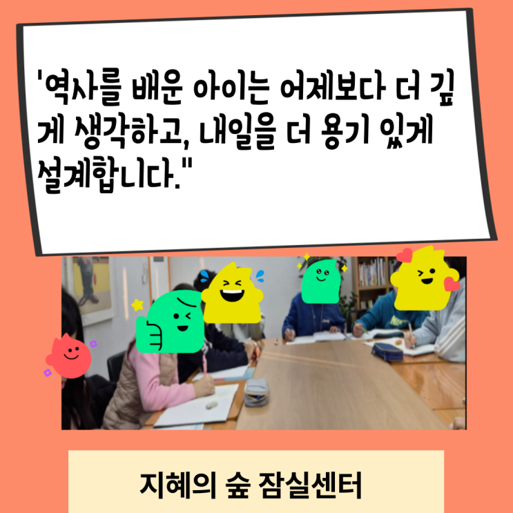 역사를 배운 아이는 어제보다 더 깊게 생각하고, 내일을 더 용기 있게 설계합니다. /지혜의 숲 잠실센터