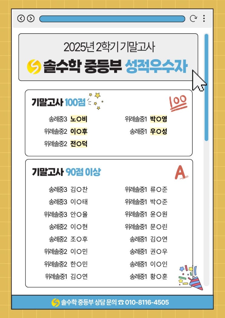 3월 들어가면 아이들이 적응하느라 학습 리듬 잡기가 늦어지는 경우가 많습니다. 그래서 2월 연휴 전, 중1~3 학년별 정규반은 자리 선점 상담 + 진단 후 맞춤 방향으로 안내드리고 있어요. 무조건적인 선행보다, 아이가 설명할 수 있는 기반부터 안정적으로 잡아드립니다. ✔️대상 : 중1 ~ 중3 ✔️ 정규반 특징 - 학년별 진단 후 수업 반 배정 - 내신 대비 핵심 단원 연결 학습 - 매 수업 풀이 과정 점검 + 약한 유형 보완 - 서술형 대비 및 풀이 습관 강화 - 학교별 기출 분석으로 내신 준비 철저 - 학부모님께 매 수업 후 학습 피드백 안내 ✔️ 수업 일정 - 상시 등록 가능 (레벨별 정규반 운영 중) → 2/13까지 신학기 자리 선점 상담 우선 진행 - 등록 후 3월 대비 학습 방향을 개별 안내 ✔️ 신청 방법 네이버 예약 - 플레이스(지도) 내 상담 예약하기 ✔️ 안내사항 - 수준별로 반이 운영되어 상담 후 반 배정됩니다. - 소수 정원으로 운영되어 원하시는 시간대는 조기 마감될 수 있어요. - 상담 시 최근 성적 / 오답 노트 / 문제집 등) 지참하시면 정확히 안내 가능합니다.
