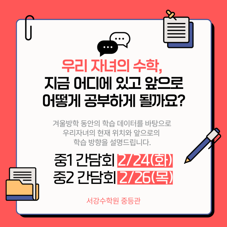우리 아이 수학, 지금 어디에 있고 앞으로 어떻게 공부하게 될까요? 안녕하세요. 서강학원 중등관입니다. 겨울방학은 단순히 진도를 나가는 시간이 아니라 앞으로의 수업 흐름이 정해지고, 학습 습관과 실력의 방향이 결정되는 중요한 시기입니다. 그래서 이번 2월 간담회는 단순한 성적 안내가 아니라 ✔ 우리 아이의 현재 학습 상태를 정확히 점검하고 ✔ 앞으로 진행될 수업 로드맵과 진도 계획을 공유하며 ✔ 실천 가능한 개인별 학습 방향을 설정하는 자리로 준비했습니다. 학생들의 수업 몰입도를 유지하고, 학부모님께는 더 깊이 있는 상담을 제공하기 위해 학부모간담회와 학생간담회를 분리운영합니다. ■ 학부모 간담회 일정 -2월 24일....... <img src="https://blogthumb.pstatic.net/MjAyNjAxMzFfMTc2/MDAxNzY5ODIwNjEyOTEz.0T2E2iQOH3scr1ROSSPG5LwXkbh2UCdVin63eDAS63gg.mbgRt6CSn8WKR9PKImMXtxCJfTdbaGtLFsEldEvVa8sg.PNG/%C3%B9%C7%AE%C0%CC%C1%A4%B4%E4%B7%FC_%281%29.png?type=s3" />