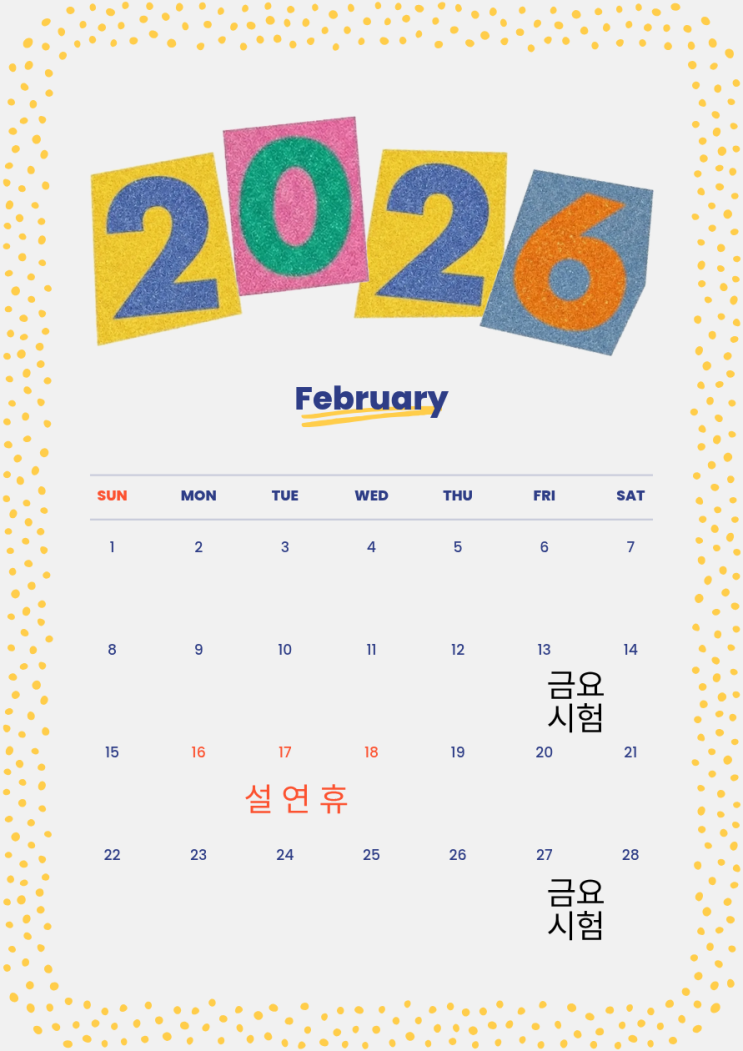 안녕하세요. 스마트해법수학 송파윤진성학원입니다. 새 학기를 앞두고 학습 리듬을 점검하는 중요한 시기인 만큼, 2월 학원 주요 일정과 함께 학습 방향에 대해 안내드립니다. 2월 금요 시험 일정 안내 2월에는 금요 시험이 총 2회 진행됩니다. 2월 13일(금) 2월 27일(금) 금요 시험은 ✔ 학습 내용 이해도 점검 ✔ 개념 정리 상태 확인 ✔ 학기 전 학습 흐름 점검 을 목적으로 진행됩니다. 시험 결과를 바탕으로 학생별 보완이 필요한 부분을 확인하고 이후 수업에 반영하고 있습니다. 설날 연휴 휴원 안내 2월 16일(월) ~ 2월 18일(수) 설날 연휴로 인해 학원 휴원입니다. 연휴 기간 동안에는 학생들이 충분히 휴식하며 그동안 배운....... <img src="https://blogthumb.pstatic.net/MjAyNjAxMzFfNTUg/MDAxNzY5ODQzMjQwMjc4._jFFo5Gr2fIuQnFEDFix_FdQUEXe2Bu7LQGLQrhbgqwg.7Z6PKR5mgBkeBPoLCUpvixPd5vS4LLO1X04-oLG51Tsg.PNG/1.png?type=s3" />