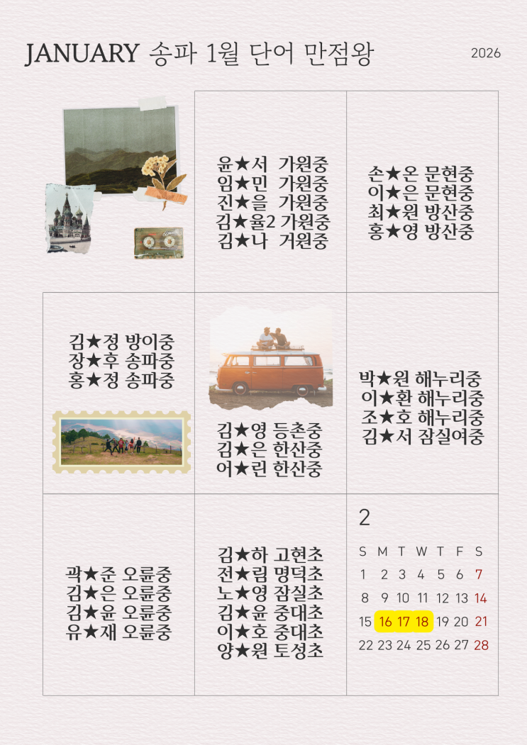 안녕하세요! 송파 영어학원의 자존심, 방이동 영어학원가의 앞선 학원, 베토영어입니다. 지난 1월 새해임에도 열심히 단어 외워온 베토 베이비들을 공개합니다~! ※상시 상담 및 입반 가능! 궁금하신 사항은 언제든 문의주세요 :) ☎️ 베토영어학원 문의 - 송파 방이동 : 02-420-8370 ■ 송파캠퍼스 카카오톡 채널 : http://pf.kakao.com/_xoNwJn/chat https://tv.naver.com/v/77341206 <img src="https://blogthumb.pstatic.net/MjAyNjAyMDJfMjE0/MDAxNzcwMDEyNjE0MDM1.c-buq7RWGNpxUOIrIqTmXmgH1QbIvxXTv7cWA9W4rKIg.8oJQjY9ROU6l15LYZ9uLz3l95gKsQfkEOLzYWpxeuXcg.PNG/%BC%DB%C6%C41%BF%F9%B4%DC%BE%EE%28%BA%ED%B7%CE%B1%D7%BF%EB%29.png?type=s3" />