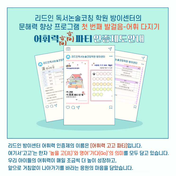 리드인 방이센터의 문해력 향상 프로그램을 소개합니다. 100권, 200권, 300권 클럽 독서 인증 제도에 이은 바로 어휘력 인증 제도입니다. 리드인 방이센터 아이들의 독서를 코칭하면서 '어휘력이 낮으면 독해력도 낮다' 라는 사실을 다시 한 번 확인했습니다. 그래서 어휘력을 향상 시키키 위해 '어휘력 고고 파티'를 기획했습니다. '어휘력 고고 파티'라고 이름을 붙인 이유는 어휘 학습이라고 하면 "싫어요", "안 해요"라고 할 아이들에게 즐거운 파티라는 이름으로 부담을 덜어 주고 싶었습니다. '고고'는 한자 '높을 高'와 영어 'GO' 의미를 모두 담고 있....... <img src="https://blogthumb.pstatic.net/MjAyNjAzMjVfNjAg/MDAxNzc0NDQ0NDM3MTU1.8fqC6uOOoxSDgKTZAOpyACKeeiHe0QMPPhb_oxVg0PIg.x0m8ZBP8EYtMv7YF5bHslIzAF-wJ9j_5xsFJ9bpzWtkg.PNG/%B8%AE%B5%E5%C0%CE%B9%E6%C0%CC%BC%BE%C5%CD_%BE%EE%C8%D6%B7%C2.png?type=s3" />