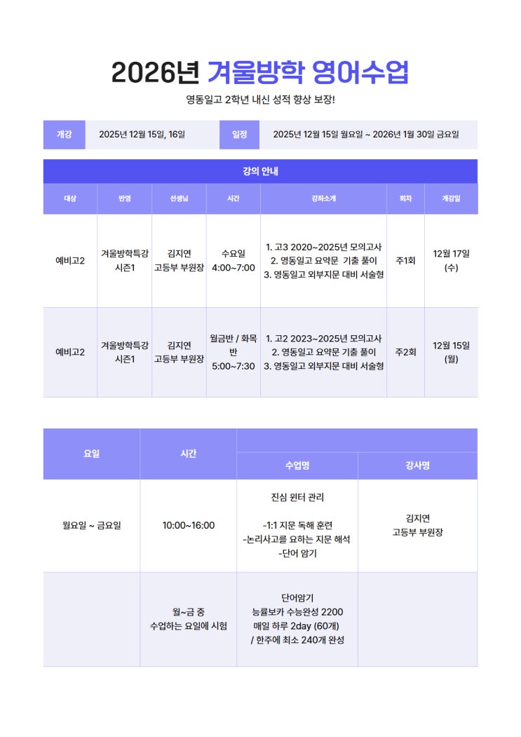 안녕하세요, 진심영어학원입니다. 잠실 부근 대부분 고등학교의 영어 시험이 까다롭고 출제 범위부터 유형이 다양해지고 있지만, 그 중 서술형과 주관식 등 학생들에게 기본 실력 이상을 확인하는 시험을 출제하는 '영동일고' 다 년간 영동일고를 전담하여 항상 학생들의 성적 향상 결과를 이끌어 주고 계시는 부원장선생님의 맞춤형 내신 성적 향상 보장 수업 '영동일고2 겨울방학 영어 수업' 안내드립니다. ✏️ 수업 정보 1. 개강일: 2025년 12월 15일(월) ~ 12월 17일(수) * 수업별 개강일 상이 2. 수업일정 기간: 2025년 12월 15일(월) ~ 2026년 1월 30일(금) 3. 대상: 영동일고 예비고2 4. 담당 선생님: 김지연 고등부....... <img src="https://blogthumb.pstatic.net/MjAyNTEyMTRfMjIg/MDAxNzY1NzAwMTU0ODI4.ntpmHns1YGYEU0DFBjCxWkROv84cbMSjEygAgpvzs7Ag.CeYfSQiCubZcu1UZtCi1j437Wx0-pulZitaSuXa9Hvkg.JPEG/2026%B3%E2_%B0%DC%BF%EF%B9%E6%C7%D0_%BF%B5%BE%EE%BC%F6%BE%F7_1.jpg?type=s3" />