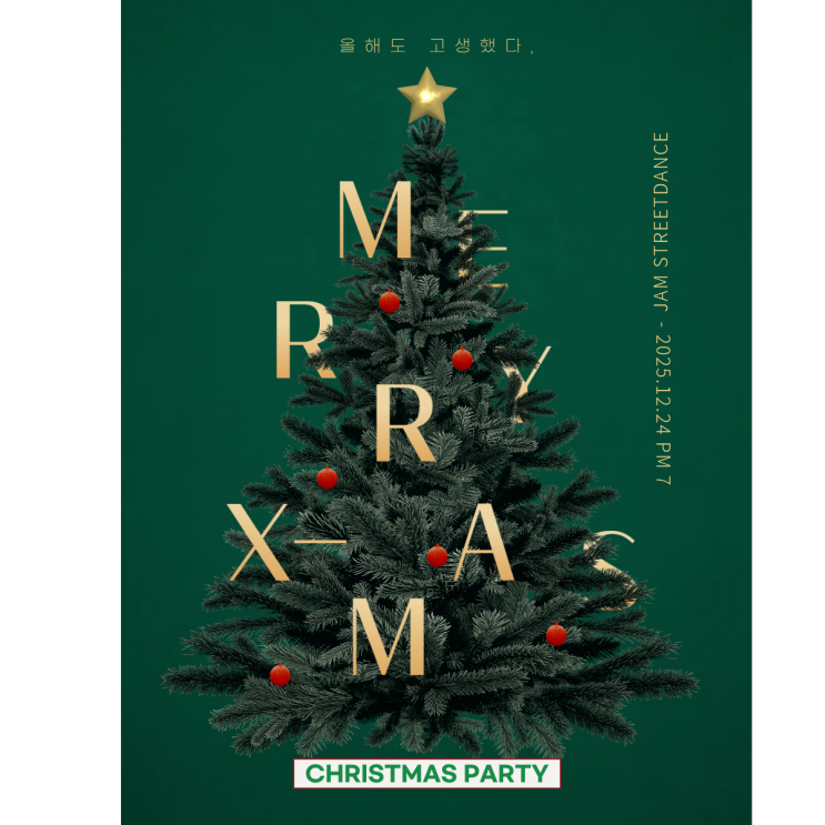 JAM STREET Christmas Party 올해도 열심히 달려온 잼 스트릿 식구들 크리스마스는 행복하게 맛있는거 먹고 아무 걱정없이 놀자~~! 일시:2025/12/24 PM 7 장소:잼스트릿댄스 준비물:마니또선물 #잼댄스스트릿 #잼댄스 #잼댄스스튜디오 #마산댄스 #마산댄스학원 #창원댄스 #창원댄스학원 #취미댄스 #스트릿학원 #왁킹 #락킹 #팝핑 #락킹 #힙합 #힐코레오 #케이팝 <img src="https://blogthumb.pstatic.net/MjAyNTEyMTVfMjUx/MDAxNzY1Nzk5NTgxNzEx.Ixq-MdY6eHPnkmQZNfsLKk-OTkShcz3DqXwcZt2Zyrsg.FuYRLrXKADITpVZoBroAVzlnoQpqgB_iU0T2VaENP6Mg.PNG/%C1%A6%B8%F1%C0%BB_%C0%D4%B7%C2%C7%D8%C1%D6%BC%BC%BF%E4.png?type=s3" />