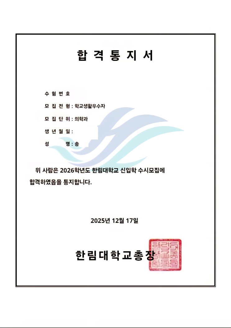 배명고3학년 송** 의대 합격(2관왕)을 축하드립니다. <img src="https://blogthumb.pstatic.net/MjAyNTEyMjlfOTEg/MDAxNzY3MDExNjgzODM5.Hhh_BlqXeqIx1iORNGsoK86ZF2f2OtRTLv6hcu_tzS4g.qJdhlQdHvql3seWNBoV0PnBCUoF9ivby-FRR4gb-6kUg.JPEG/%C7%D1%B8%B2%B4%EB%C0%C7%B4%EB.jpg?type=s3" />