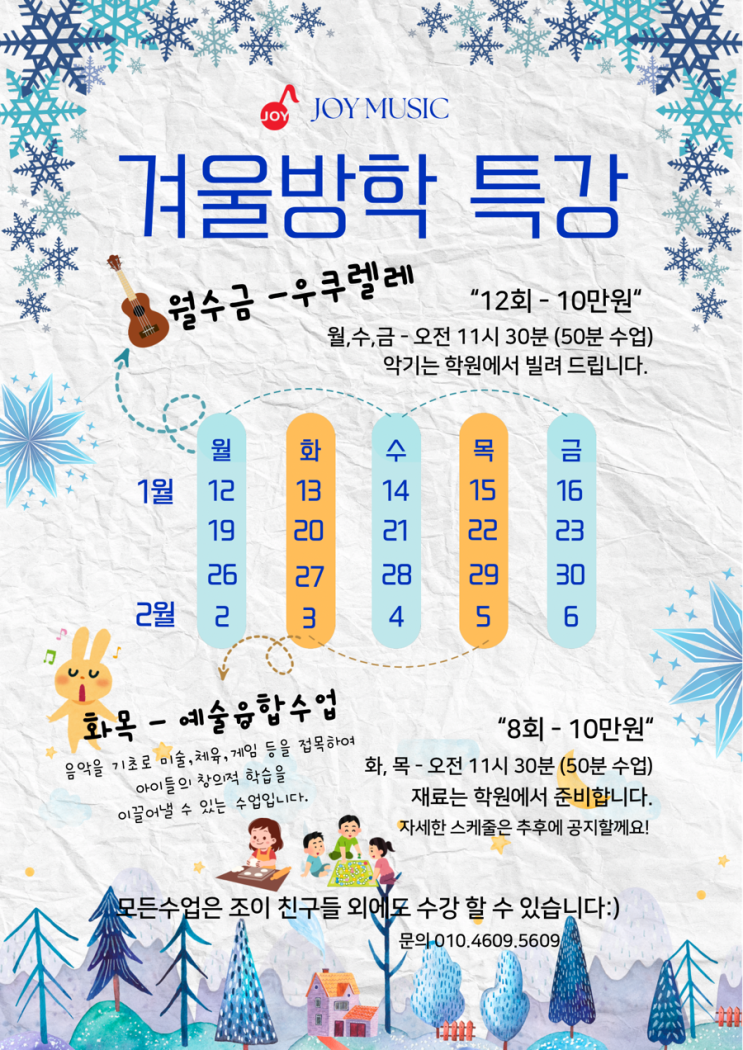 겨울 방학 특강입니다❄️ 월. 수. 금 - 우쿠렐레 화. 목 - 예술융합수업 선착순입니다. 바로 연락주세요 <img src="https://blogthumb.pstatic.net/MjAyNTEyMTdfMjk2/MDAxNzY1OTcwNTUyNjY2.Pnpug7Eew1PgpApXOIqGyd-v0RTEei4u8lHkvbke5YYg.ntaBbpz8NesLA13pNyb-QR1Imidd0ASk7M7p9eAbZ1Eg.PNG/IMG%A3%DF5910.PNG?type=s3" />