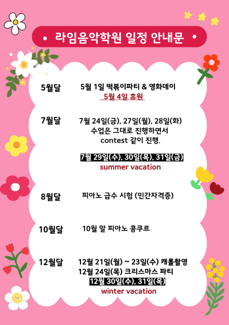 즐겁게, 정확하게 배우는 피아노 라임음악학원 입니다 #명원초피아노 #차량운행피아노학원 #고명초피아노 #명덕초피아노 #명일초피아노 #솔베뉴피아노 #솔베뉴음악학원 #명일동피아노 #삼익그린음악학원 #명일동음악학원 #신동아아파트피아노 #삼익가든피아노학원 #LG자이피아노학원 #우성아파트 안녕하세요 ^^ 따뜻한 봄바람과 함께 4월이 찾아왔습니다. 봄 햇살처럼 따뜻하고 벚꽃처럼 화사한 한 달 보내시길 바랍니다 3월 중순부터 3시~5시대 수업 및 차량 운행이 모두 마감되어 대기 등록으로 안내 해드리고 있었는데요 자리가 생기는 대로 순차적으로 안내드릴 예정이오니, 조금만 기다려 주시면 감사하겠습니다 새 학기가 시....... <img src="https://blogthumb.pstatic.net/MjAyNjAzMzBfMTMz/MDAxNzc0ODQ3NjYwMjI3.4fWCzPFwN04uGqaPQ53OQvDHFkJBTYrmH2jlMEGwzp8g.Op9Ij094KJvRPJoKCkmFbK-NCyns36vpJUdm0V_QxKYg.PNG/1.png?type=s3" />